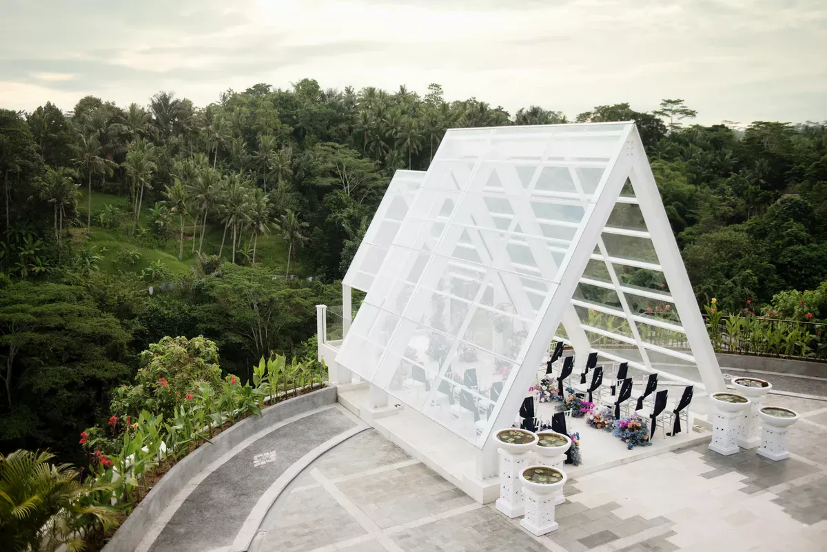 A timeless white wedding chapel embraced by breathtaking jungle views, creating the perfect setting for your ceremony.