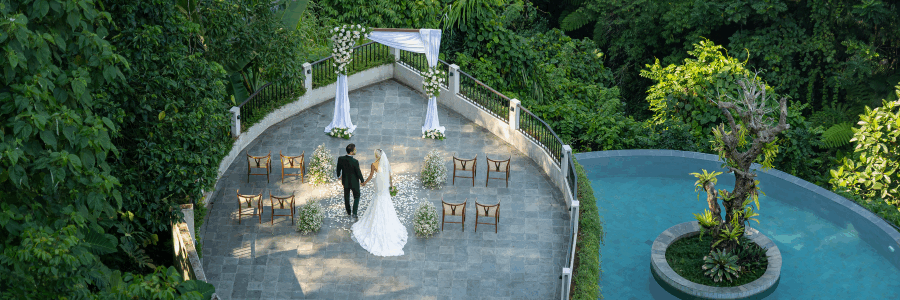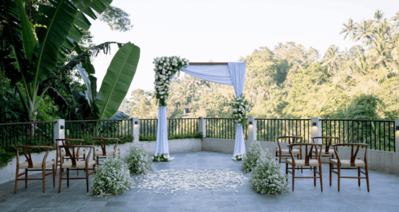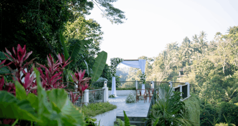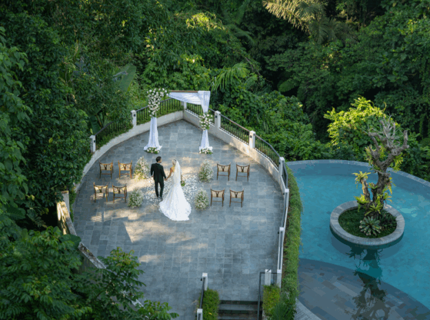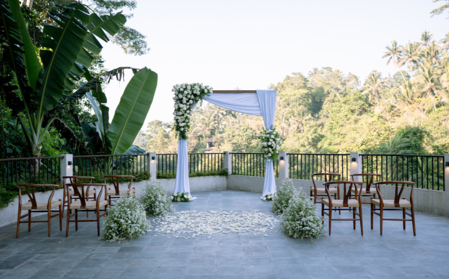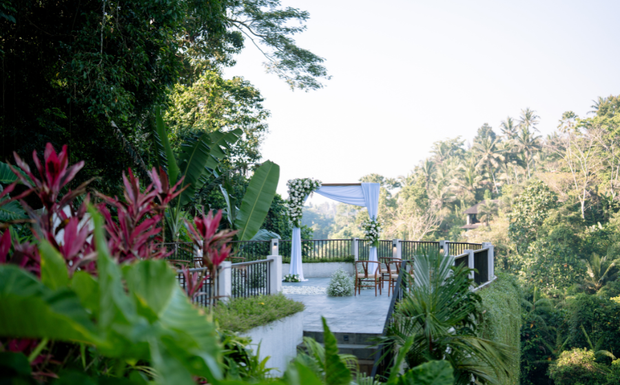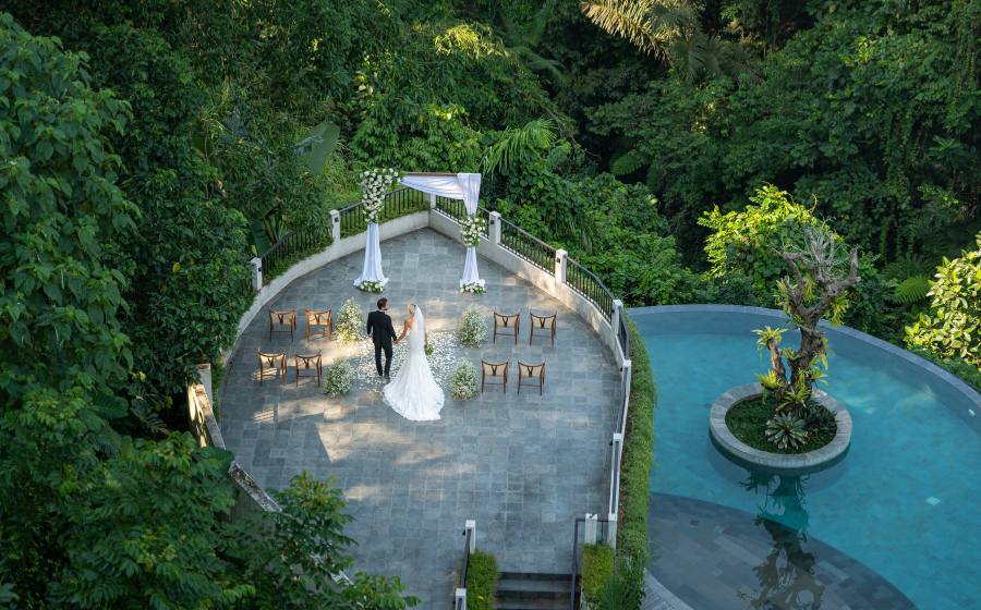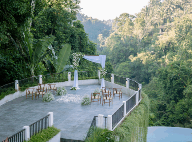 An intimate open-air venue overlooking the lush Ubud valley, perfect for exchanging vows surrounded by nature’s serenity. Perched above the jungle canopy, the Jinengku Deck offers a breathtaking view of tropical greenery and gentle sounds of nature as your ceremony backdrop. With its elegant stone flooring, minimalist floral setup, and seamless connection to the infinity pool, this tranquil space creates a timeless and romantic atmosphere for small weddings or elopements. Ideal for couples seeking a private, natural, and unforgettable wedding experience in the heart of Ubud.